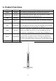 2. Product Functions LEDs Status Power On/Off AP/Router On/Off USB On/Off Wireless Blinking Meaning When starting up MZK-W04NU, the Power LED will be on. When switching to Router mode, the LED will be on. When switching to AP mode, the LED will be off. When connecting with a USB storage device, the LED will be on. The LED will be blinking steadily while the wireless reception is fine. When the connection is established between MZK-W04NU and a LAN On/Blinking host, the LAN LED will be on.