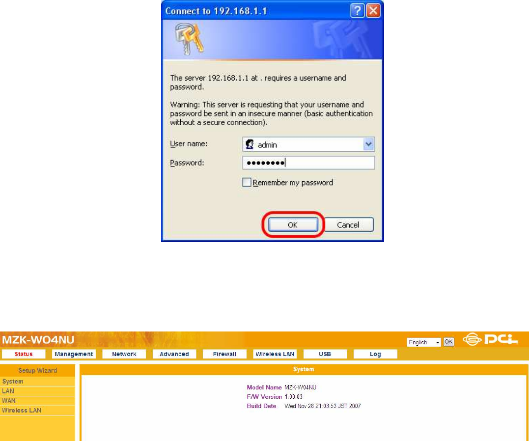 3. Enter the default User Name “admin” and Password “password” and then click “OK” to