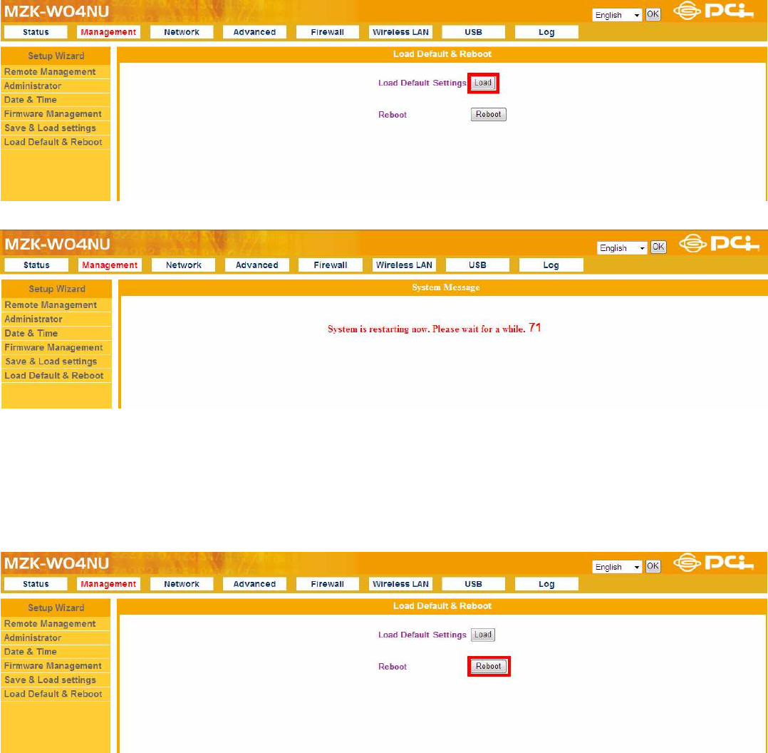 Go to the “Load Default & Reboot” configuration page, and then click “Reboot” to restart the
