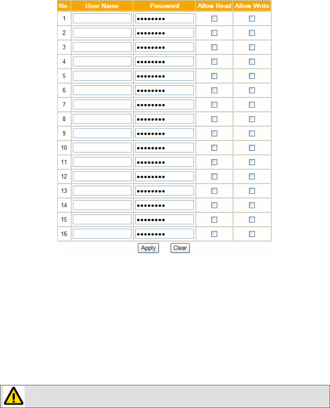 User Name:Enter an alphanumeric name and its case-sensitive. You can set 16 sets of