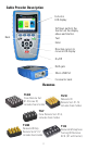Cable Prowler Description Full-color LCD display Soft keys perform the function on the display above each button. Back Test Enter Direction cursors to move in LCD display On/Off RJ45 jack Micro USB Port F-connector Jack Remotes T120C Coax Remote Set: #1-20 coax ID; includes foam holder T121C Network ID Remote Set: #1-19 includes foam holder T127 Coax Remote Set: #1-8, includes foam holder T128C Network ID Only Remote Set: #1-12 includes foam holder T139 Network &Telephone Testing/ID Remotes #2-8.