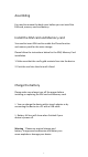 Assembling You need to remove the back cover before you can install the SIM card, memory card and battery. Install the SIM card and Memory card You need to insert SIM card to enable the Phone function and memory card for the extra storage. Please follow the instructions below for the SIM/ Memory Card installation. 1. Make sure that the card’s gold contacts face into the device. 2. Push the card into the slot until it fixed.