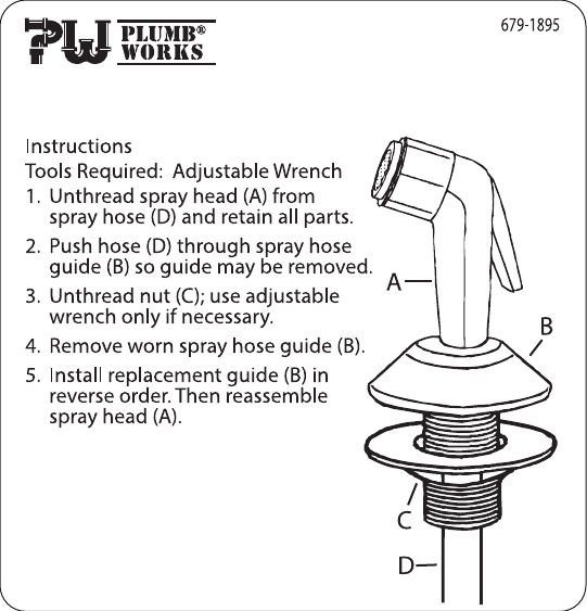 679-1895 P e Instructions Tools Required: Adjustable Wrench 1. Thread spray head (A) from spray hose (D) and retain all parts. 2. Push hose (D) through spray hose guide (B) so guide may be removed. 3. Thread nut (C); use adjustable wrench only if necessary. 4. Remove worn spray hose guide (B). 5. Install replacement guide (B) in reverse order. Then reassemble spray head (A).