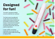 Product Features • Simple to use, with one click to start and stop. • Removable parts for easy cleaning. • Stylish, ergonomic design for a natural positioning in the hand. • Designed for both right and left-handed users. • Manual or Automatic extrusion. • Works with the Polaroid Candy Cartridges, available in 6 fantastic sugar-free colours and flavours: Strawberry, Orange, Lemon, Apple, Grape and Cola. • 4 FREE Candy Cartridges included with each CandyPlay 3D Pen (Strawberry flavour).