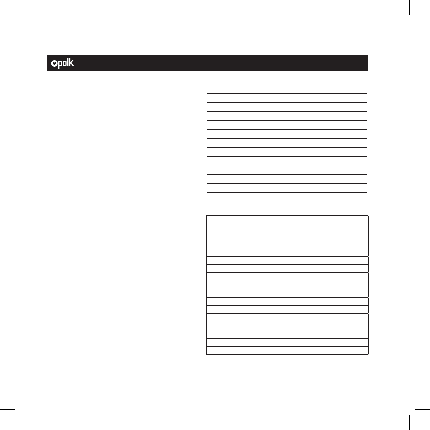 Asistencia técnica Gracias por la compra de este producto Polk. Si tiene preguntas o comentarios, no dude en comunicarse con nosotros por teléfono o correo electrónico, En América del Norte, comuníquese con el servicio al cliente de Polk llamando al 800-377-7655 (lunes a viernes, de 9:00 AM a 5:30 PM, hora este) o escribiendo a polkcs@polkaudio.com. Fuera de EE.UU., llame al +1-410-358-3600. Comuníquese con nosotros directamente Polk 5601 Metro Drive Baltimore, MD 21215 800-377-7655 | www.polkaudio.