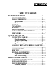 Table Of Contents BEFORE STARTED . . . . . . . . . . . . . . . . . . . . . . . 1 CONGRATULATION . . . . . . . . . . . . . . . . . . . . . .1 PRODUCT BRIEFING . . . . . . . . . . . . . . . . . . . . . 1 Descriptions . . . . . . . . . . . . . . . . . . . . . . . . . . 1 Features . . . . . . . . . . . . . . . . . . . . . . . . . . . . .1 MODELS . . . . . . . . . . . . . . . . . . . . . . . . . . . . . . . . .1 UNPACKING . . . . . . . . . . . . . . . . . . . . . . . . . . . . . 1 OPTIONS . . . . . . . . . . . .