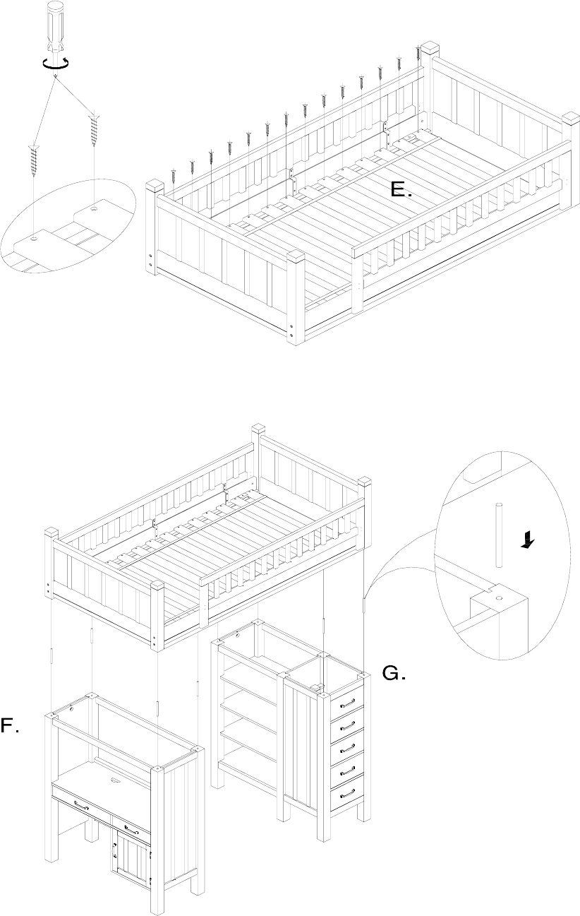 and place the Upper Bunk on top of the Desk End (F) and Storage End (G) units by aligning the pre-drilled holes on