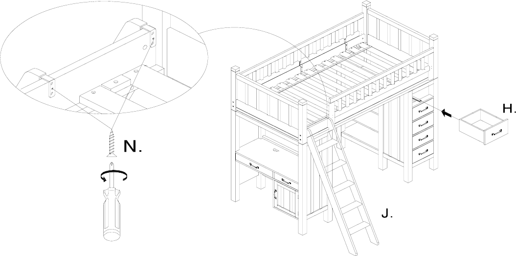 8. Replace Drawer (H) into Storage End. Attach the Ladder (J) to the opening of the Short Guardrail. Place the brackets