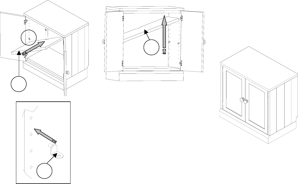 Insert two Shelf Supports (B) into the pre-drilled holes on one side pushing firmly until fully inserted.