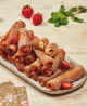 French Toast Rolls Ingredients 8 oz cream cheese zest of ½ orange Serves 4 Directions 1. Combine the cream cheese, orange zest, and 2 tbsp. sugar in a bowl to make a cream cheese filling. 2 tbsp. plus ½ cup sugar, divided 2. Place the bread slices on a cutting board and roll the bread flat with a rolling pin. 12 slices white bread 3. Spread 1 tbsp. cream cheese filling on each bread slice. 1 18-oz squeeze bottle strawberry jam 4. Squeeze a line of strawberry jam on top of the cream cheese.