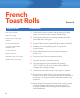 French Toast Rolls Ingredients 8 oz cream cheese zest of ½ orange Serves 4 Directions 1. Combine the cream cheese, orange zest, and 2 tbsp. sugar in a bowl to make a cream cheese filling. 2 tbsp. plus ½ cup sugar, divided 2. Place the bread slices on a cutting board and roll the bread flat with a rolling pin. 12 slices white bread 3. Spread 1 tbsp. cream cheese filling on each bread slice. 1 18-oz squeeze bottle strawberry jam 4. Squeeze a line of strawberry jam on top of the cream cheese.