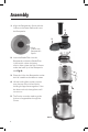 Disassembly IMPORTANT: Before disassembly, make certain the appliance is shut off and the power cord is unplugged from the power outlet. Ensure the motor is stopped and allow 10 minutes to cool. 1. Lift and remove the Pusher from the Chute. 2. Grasp the Locking Bar and rotate downward. This will release all components for easy disassembly. 3. Lift and remove the Lid and Pulp Guard. 4. Lift and remove the Receptacle, which contains the Blade/ Filter.