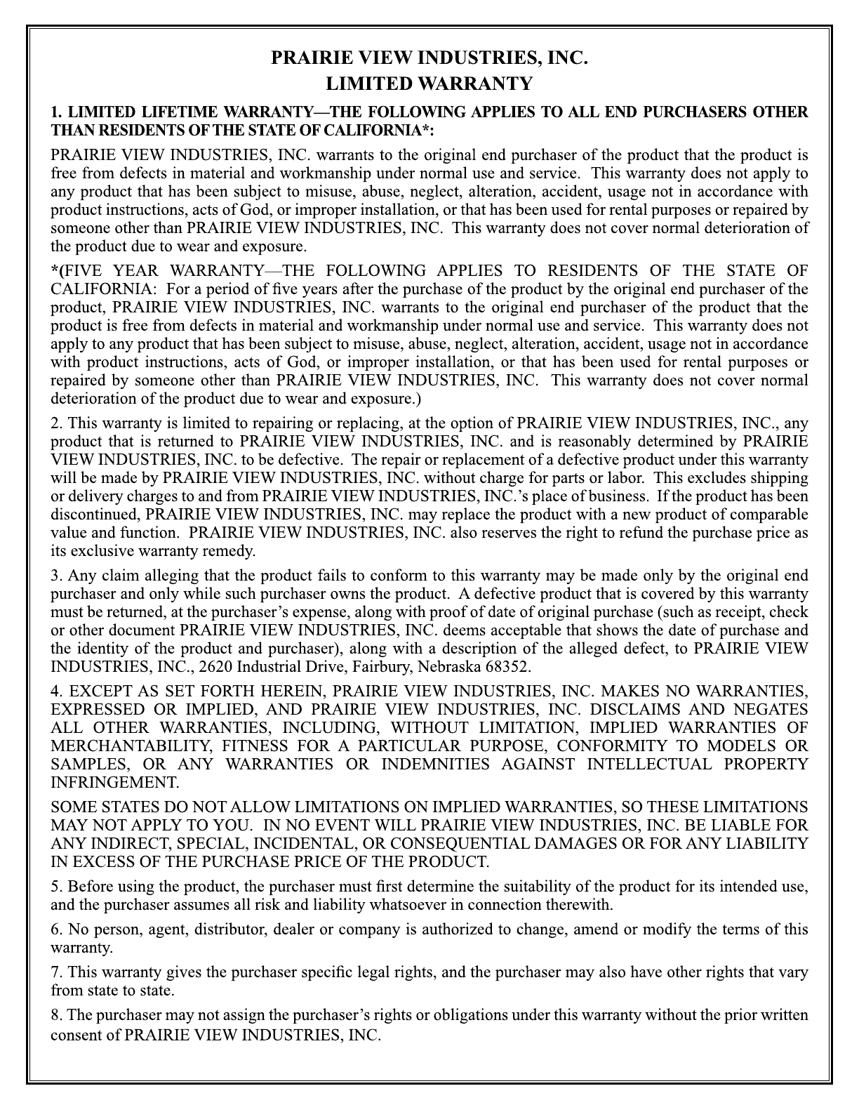 2. This warranty is limited to repairing or replacing, at the option of PRAIRIE VIEW INDUSTRIES, INC., any