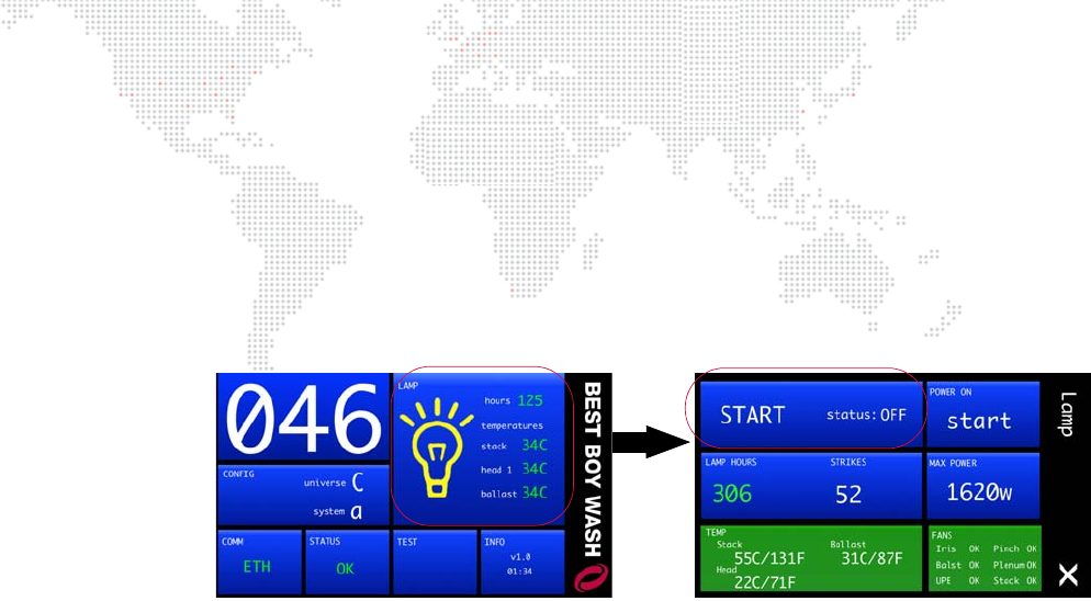 The lamp can be started (turned on) via console command or at the luminaire itself using the Menu Touchscreen.