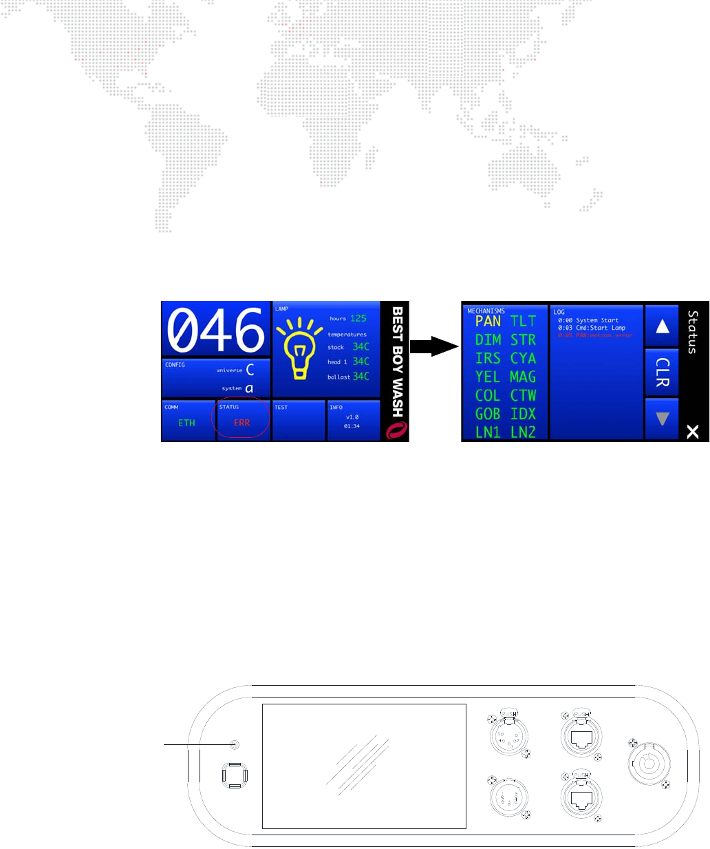 The Status screen will indicate which specific mechanisms, if any, have errors. It also provides a log of systems