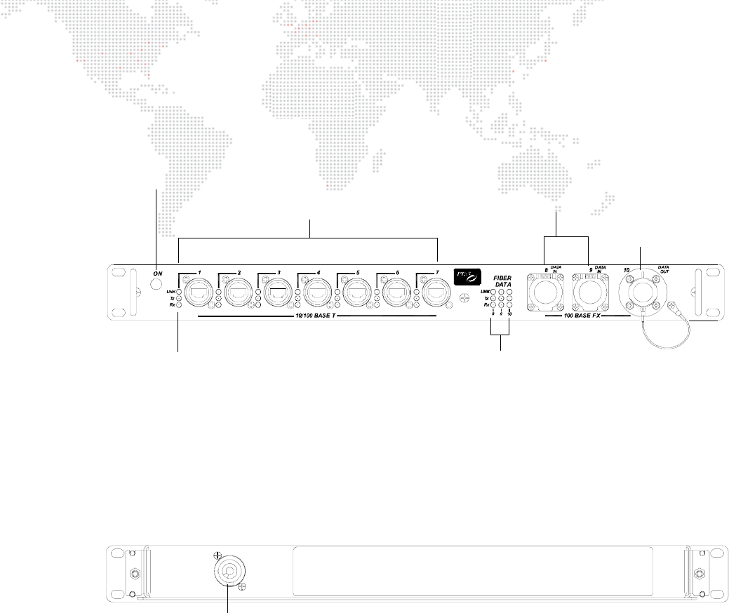 The Series 400 10-Port Ethernet Switch contains the following connections and LED indicators.