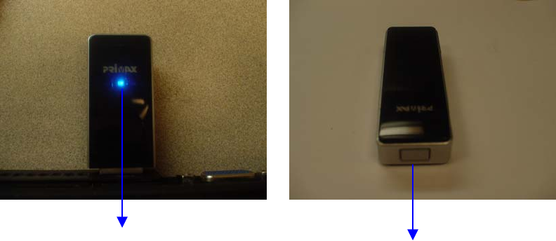 The dongle contains a blue indicator light and a pairing button. It is shown in