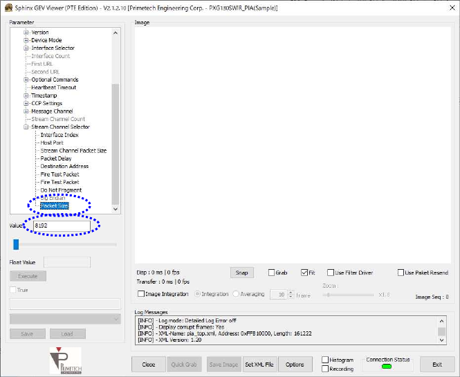 Launch Sphinx GEV Viewer and select "Transport Layer Control"-> "Stream Channel Selector"-> "Packet