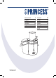 • Coloque o jarro de polpa (7) no aparelho: - Incline o jarro de polpa ligeiramente para a frente. - Insira primeiro a extremidade superior, depois a extremidade inferior do jarro de polpa. • Coloque a tampa (8) no aparelho. • Suba a pega de bloqueio (3). Certifique-se de que a pega de bloqueio (3) está bloqueada em ambas os lados da tampa (8). Parabéns! Adquiriu um produto Princess. O nosso objectivo é fornecer produtos de qualidade com um design atraente e a um preço acessível.