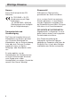 Inhaltsverzeichnis Sicherheitshinweise……………………………………………………………………….. Wichtige Hinweise………………………………………………………………………….. Normen…………………………………………………………………………………….... Transportschutz und Grundreinigung……………………………………………………. Stromausfall………………………………………………………………………………… Abschalten des Gerätes…………………………………………………………………... Geräusche………………………………………………………………………………….. Geräteübersicht…………………………………………………………………………….. Bedienung…………………………………………………………………………………… Inbetriebnahme.………………………………………………………………………........