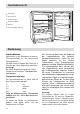 Geräteübersicht ➀ Türablagen ➁ Flaschenfach ➂ Gemüseschalen ➃ Tauwasser-Abfluß ➄ Ablagen ➅ Thermostat/Beleuchtung ➅ ➀ ➄ ➀ ➃ ➂ ➁ Bedienung Inbetriebnahme Netzstecker in die Steckdose einstecken. Thermostatknopf auf die gewünschte Stellung drehen. Vor dem ersten Einlagern das Gerät ca. 4 Stunden bei höher Reglerstufe vorkühlen. Achtung! Bei höher Reglerstellung können MinusTemperaturen auftreten - Flaschen können platzen. Temperaturregelung Die Gesamttemperatur im Gerät wird mit dem Thermostaten geregelt.