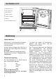 Geräteübersicht ➀ Butter/Käse-Fach ➁ Kleinteilebehälter ➂ Flaschenfach ➃ Gemüseschalen ➄ Tauwasser-Abfluß ➅ Ablagen ➆ Thermostat/Beleuchtung ➆ ➀ ➁ ➅ ➄ ➃ ➂ Bedienung Inbetriebnahme Netzstecker in die Steckdose einstecken. Thermostatknopf auf die gewünschte Stellung drehen. Vor dem ersten Einlagern das Gerät ca. 4 Stunden bei höher Reglerstufe vorkühlen. Achtung! Bei höher Reglerstellung können MinusTemperaturen auftreten - Flaschen können platzen.