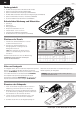 DE Testen des Bootes im Wasser 1. Fahren Sie das Boot zuerst langsam in Ufernähe. 2. Sollte das Boot nicht geradeaus fahren, justieren Sie den Trimmregler auf dem Sender. 3. Fahren Sie das Boot an Land zurück, wenn es langsamer wird oder die Niedrigtrennspannung aktiviert wird. 4. Den Geschwindigkeitsregler ausschalten und den Akku trennen. 5. Schalten Sie den Sender aus. HINWEIS: Der Empfänger sollte immer VOR dem Sender AUSGESCHALTET werden.