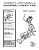 www.proform.com Model No. PFEL04909.0 Serial No. Write the serial number in the space above for reference. Serial Number Decal (on underside of frame) QUESTIONS? If you have questions, or if parts are damaged or missing, DO NOT CONTACT THE STORE; please contact Customer Care. IMPORTANT: Please register this product (see the limited warranty on the back cover of this manual) before contacting Customer Care. 1-888-533-1333 CALL TOLL-FREE: Mon.–Fri. 6 a.m.–6 p.m. MT Sat. 8 a.m.–4 p.m.