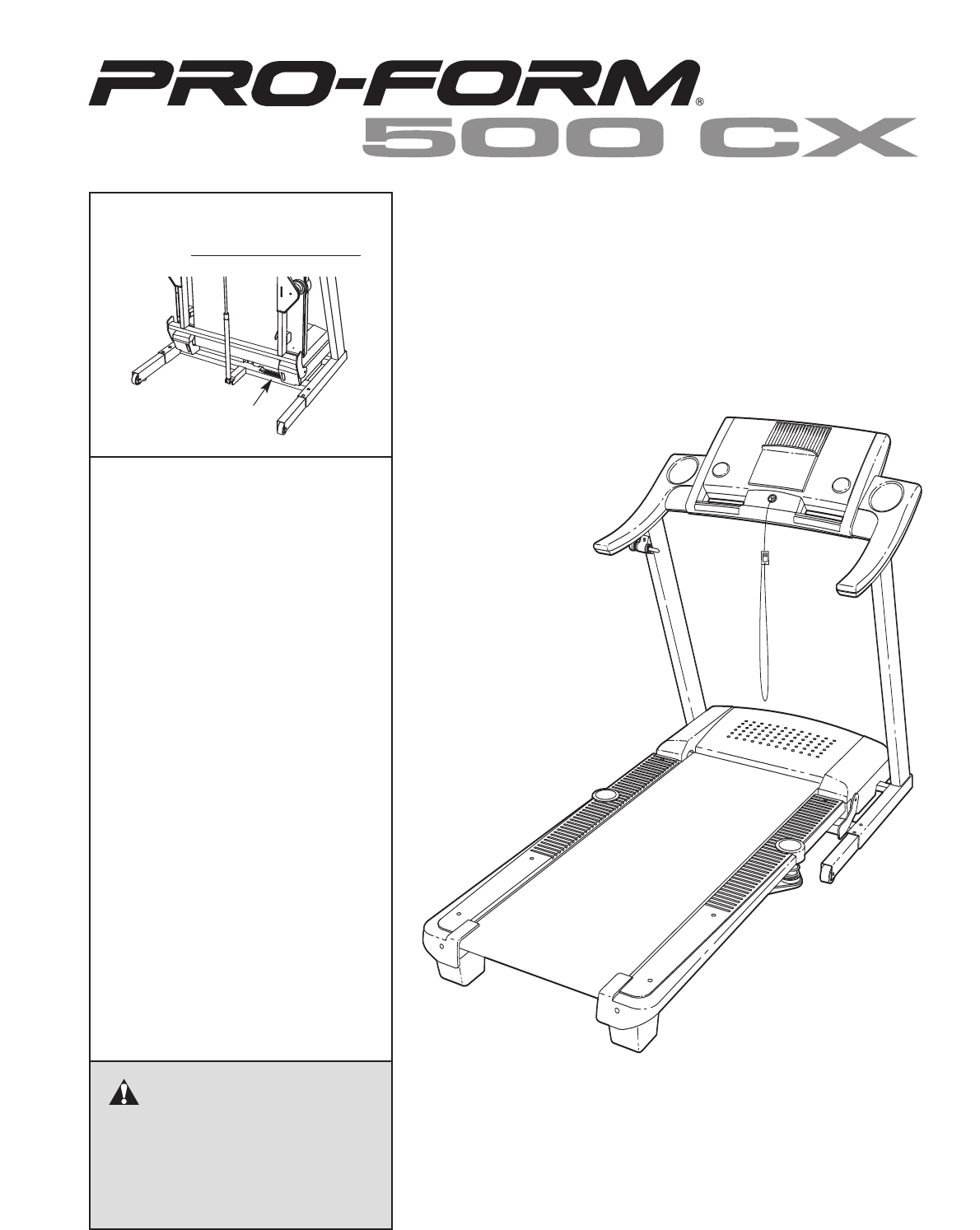 BEFORE YOU BEGIN Thank you for selecting the revolutionary PROFORM® 500 CX treadmill. The 500 CX treadmill offers an impressive array of features designed to make your workouts at home more enjoyable and effective. And when you’re not exercising, the unique 500 CX treadmill can be folded up, requiring less than half the floor space of other treadmills. reading this manual, please see the front cover of this manual. To help us assist you, note the product model number and serial number before contacting us.