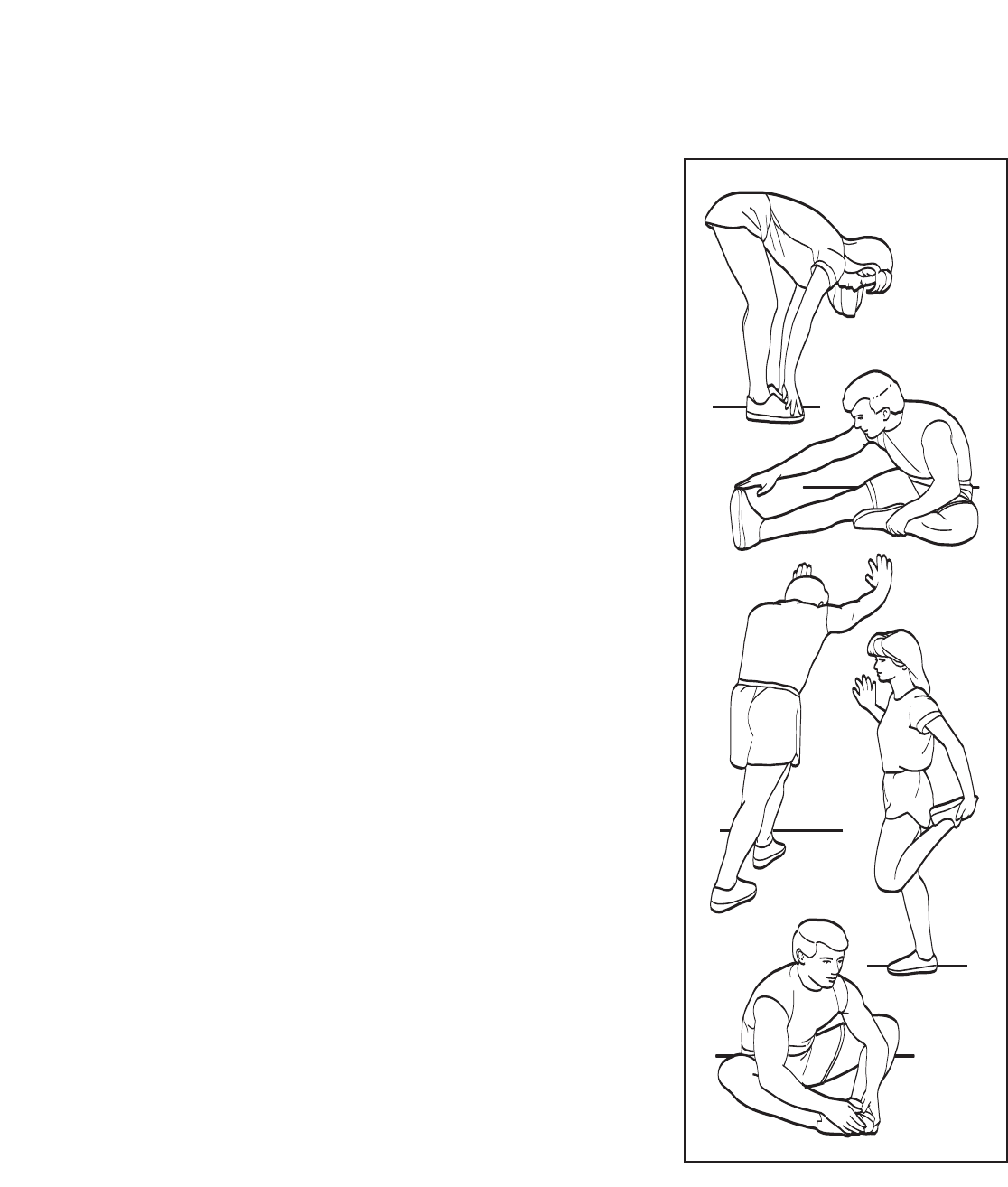 he correct form for several basic stretches is shown at the right. Move slowly as you stretch—never bounce.