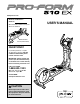 www.proform.com Model No. PFEL05911.0 Serial No. Write the serial number in the space above for reference. Serial Number Decal (under frame) QUESTIONS? If you have questions, or if parts are damaged or missing, DO NOT CONTACT THE STORE; please contact Customer Care. IMPORTANT: Please register this product (see the limited warranty on the back cover of this manual) before contacting Customer Care. CALL TOLL-FREE: 1-888-533-1333 Mon.–Fri., 6 a.m.–6 p.m. MT Sat. 8 a.m.–4 p.m. MT ON THE WEB: www.