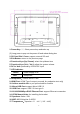 1. Power Key: (1).Short press sleep and wake up (2).Long press to pop out the power off and reboot dialog box 2. SD Card Slot / Cover: support external SD card 3. Exit Button: return to the previous page 4. Function Keys (Up / Down): select the up/down item 5. Function Keys (Vol+ / Vol-): adjust the system volume 6. DC In Jack: powered by 12V/2A DC input 7. LED Indicator: Green Power supply is on. Red sleep state. 8. Headphone:3.5mm Stereo + MIC 9.
