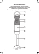 Описание компонентов 1 2 3 4 5 6 7 8 Петелька Ручка управления Нажимная кнопка I Нажимная кнопка II Корпус двигателя Кнопки для присоединения / отсоединения Блендер Нож Инструкции • Перед пюрированием твёрдых продуктов питания необходимо измельчить их (макс. Ø 1,5 cм) и добавить немного жидкости. • Работа с интервалами: Не давайте устройству работать беспрерывно более 1 минуты. Перед повторным включением дайте прибору примерно 1 минуту остынуть.