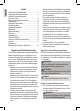 Tartalom A Kezelőszervek Elhelyezkedése........................... 3 Általános biztonsági rendszabályok.....................36 A készülékre vonatkozó speciális biztonsági rendszabályok......................................37 Rendeltetésszerű használat.................................37 A csomag tartalma................................................37 A készülék kicsomagolása....................................37 Alkotórészek leírása..............................................37 Használati útmutató......