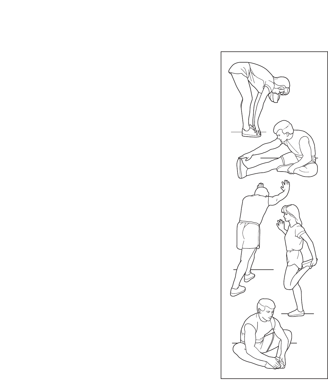 The correct form for several basic stretches is shown at the right. Move slowly as you stretch—never bounce.