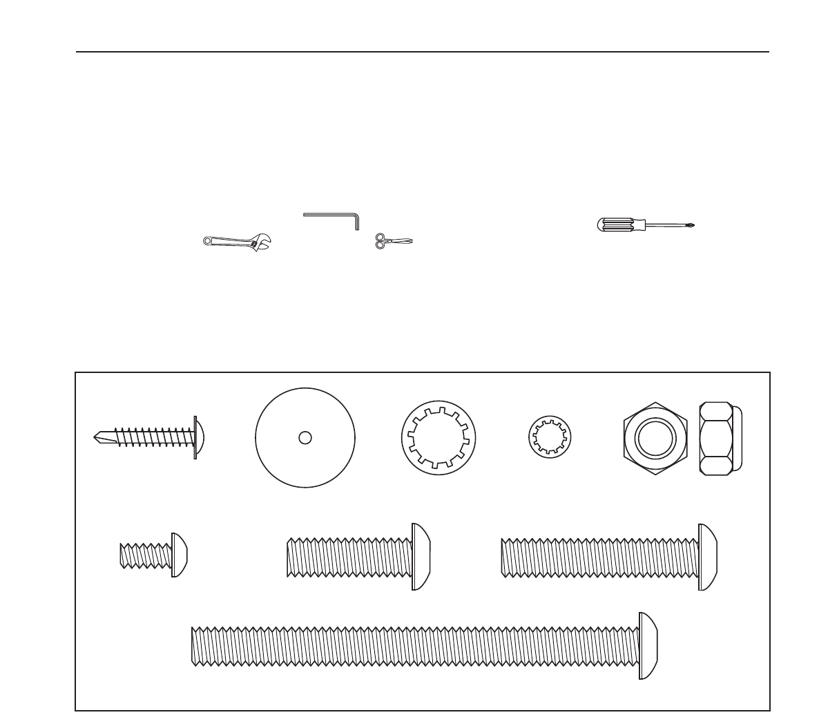 Use the drawings below to identify the assembly hardware. The number in parentheses below each drawing is