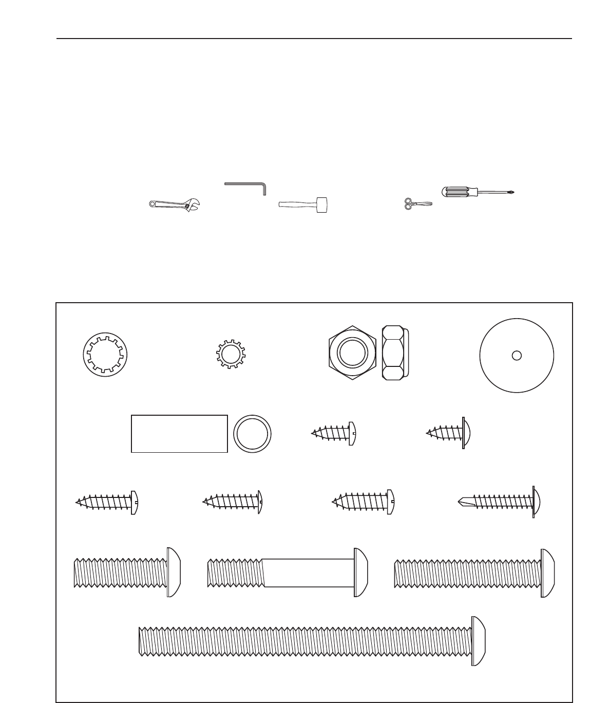 Use the drawings below to identify the assembly hardware. The number in parentheses below each drawing is
