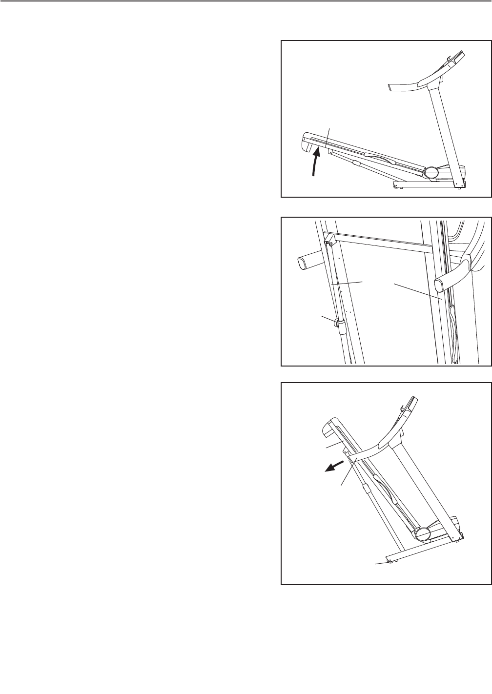 1. See drawing 2. Hold the upper end of the treadmill with your right hand. Pull the latch knob to the left and hold