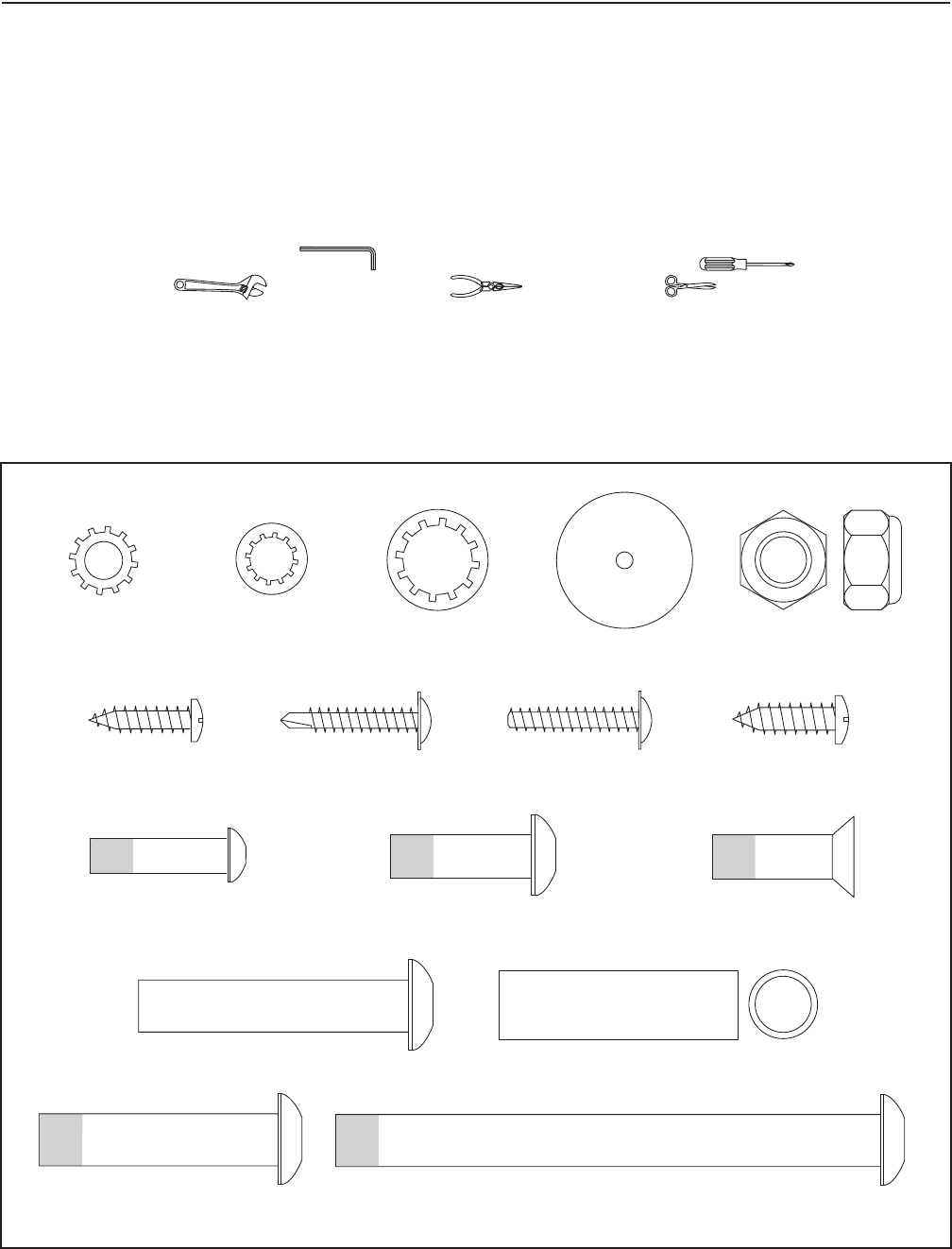 Use the drawings below to identify the assembly hardware. The number in parentheses below each drawing is