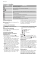 progress Visningar av värmelägen Display Beskrivning Kokzonen är avstängd. Håll värmeSTOP + GO-funktionen är påslagen. - Kokzonen är på. Det är fel typ eller ett för litet kokkärl eller finns inget kokkärl på kokzonen. Ett fel har uppstått. En kokzon är fortfarande varm (restvärme). Funktionslåset/Barnlåset är aktiverat. Strömmen är påslagen. Den automatiska avstängningen har aktiverats.