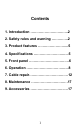 Contents 1. Introduction …………………………..2 2. Safety rules and warning …………..2 3. Product features ……………………..5 4. Specifications …………………….…..5 5. Front panel ………………………….…6 6. Operation ………………………….…..8 7. Cable repair……………………………12 8. Maintenance ………………………….17 9. Accessories ………………………..