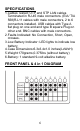 SPECIFICATIONS 1. Cables Tested: UTP and STP LAN cables Terminated in RJ-45 male connectors. (EIA/ TIA 568)RJ-11 cables with male connectors, 2 to 6 connectors installed. USB cables with Type A flat plug on one end and type B square Plug on other end. BNC cables with male connectors. 2. Faults Indicated: No Connection, Short, Open, crosses. 3. Low Battery Indicator: LED lights to indicate low battery 4. Case Dimensions:6.3x3.4x1.0 inches(LxWxH) 5. Weight:170grams,0.375Ibs (without battery) 6.
