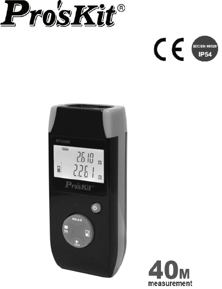 Thanks for buying Pro’sKit NT-6540 Laser Distance Measurer (40M). Please read these instructions carefully before using the product. SAFETY INSTRUMENT Permitted use • Measuring distances • Computing functions, e. g. areas. • Indirect Measuring with Pythagorean Theorem. Prohibited use • Using the instrument without instruction • Using outside the stated limits • Deactivation of safety systems and removal of explanatory and hazard labels • Opening of the equipment by using tools (screwdrivers, etc.