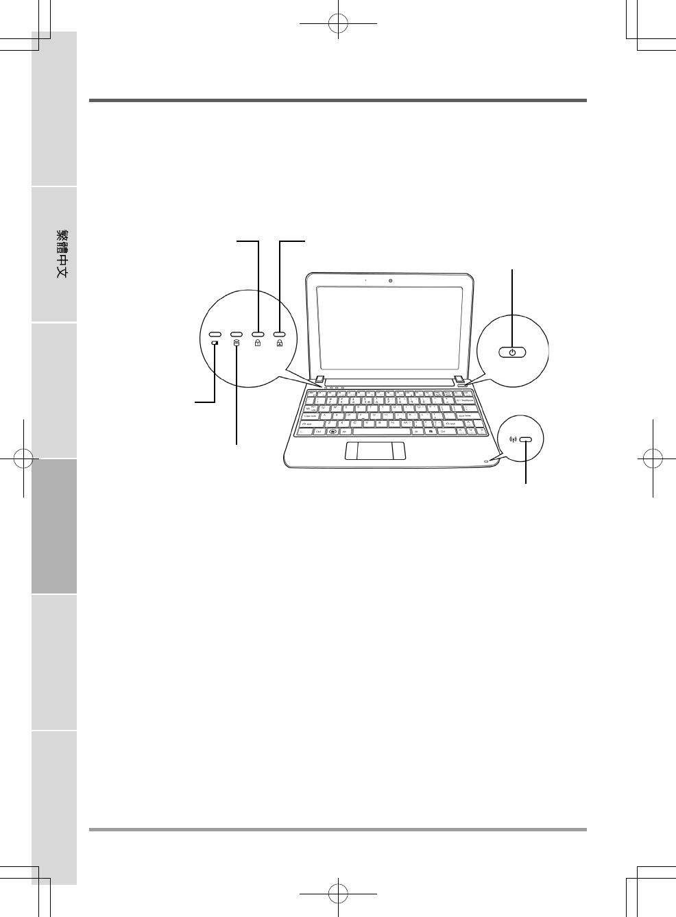 Ruhestatus, Akku/AC-Netzadapterstatus, Festplattenaktivität (HDD), Num Lock, Caps Lock