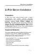 Table of Contents COPYRIGHT ............................................................................. I 1. INTRODUCTION .............................................................1-1 PRODUCT OVERVIEW .........................................................1-1 HARDWARE INSTALLATION .................................................1-4 2. PRINT SERVER INSTALLATION ................................2-1 PREPARATION .....................................................................2-1 SUPPORTED NETWORKS .
