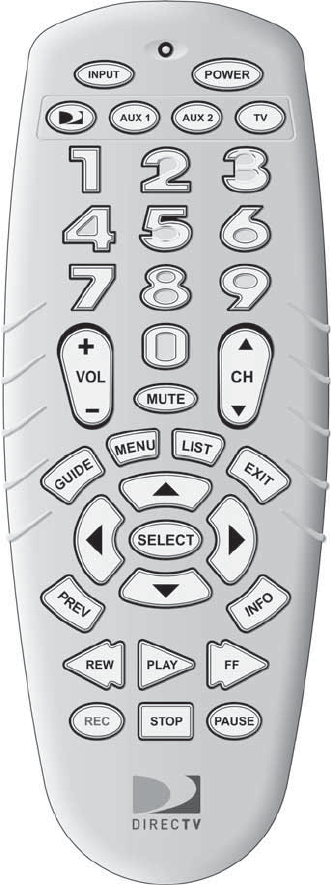 Press this key… To… Use the arrows to move the cursor in the program Guide and menu screens. Press SELECT to choose options from the selected device's menu or Guide. Display the Quick Menu in DIRECTV mode, or other menu for another selected device. View the current channel and program information. Raise or lower the sound level. Turn the sound off or on. Select the next or previous channel. Select next or previous chapter on some models of DVD players.
