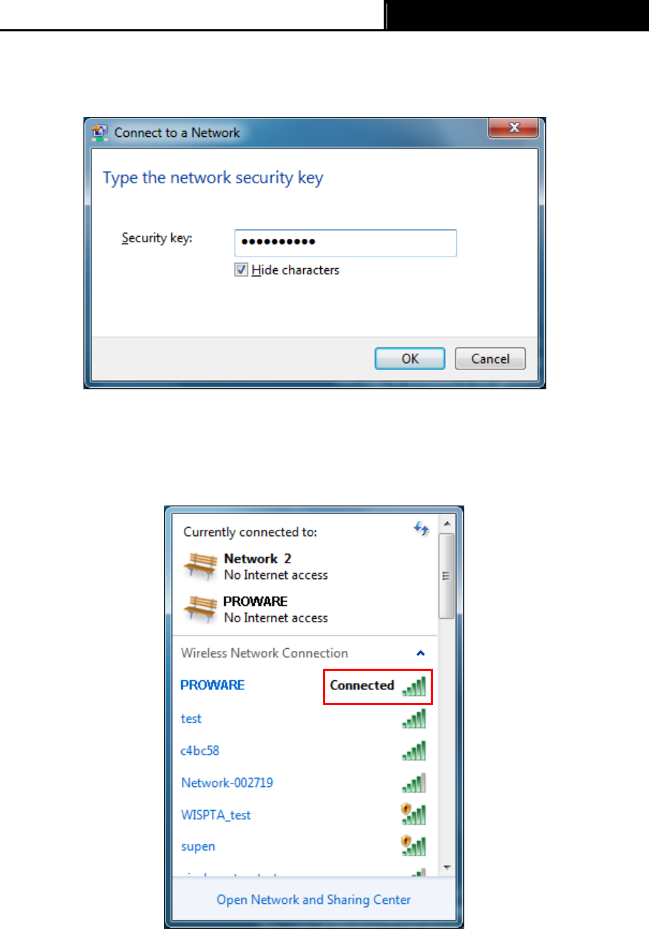 2. If your wireless network is secured, you will be required to enter the security key as shown