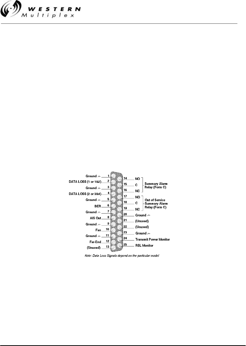 External alarm outputs are provided at the 25-pin, D-type subminiature ALARM connector. There are