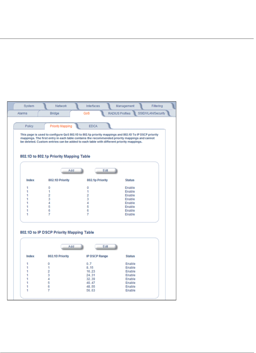 mappings (for layer 3 policies). The first entry in each table contains the recommended priority mappings. Custom entries
