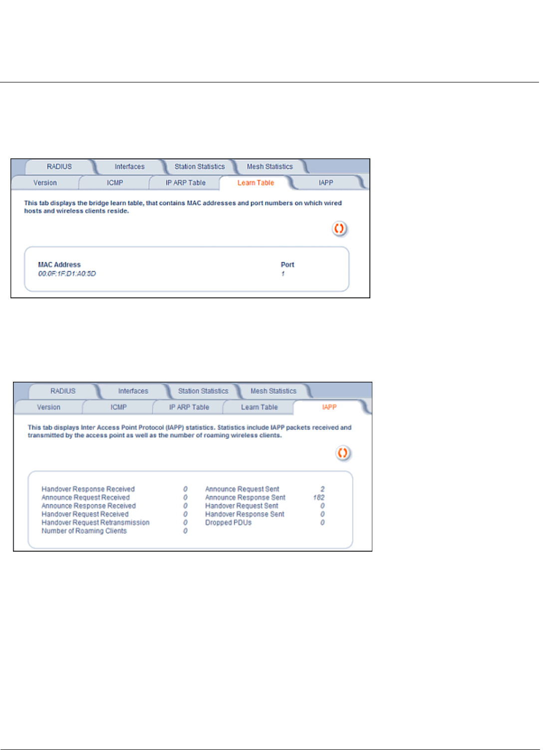 This tab displays information relating to network bridging. It reports the MAC address for each node that the device has